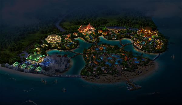 温泉城用地规模8万平方米,具有异域风情的温泉世界,分为泰国温泉SPA湾、日本樱花风吕湾等六个区域,汇集土耳其、日本、意大利等国120项风情温泉。